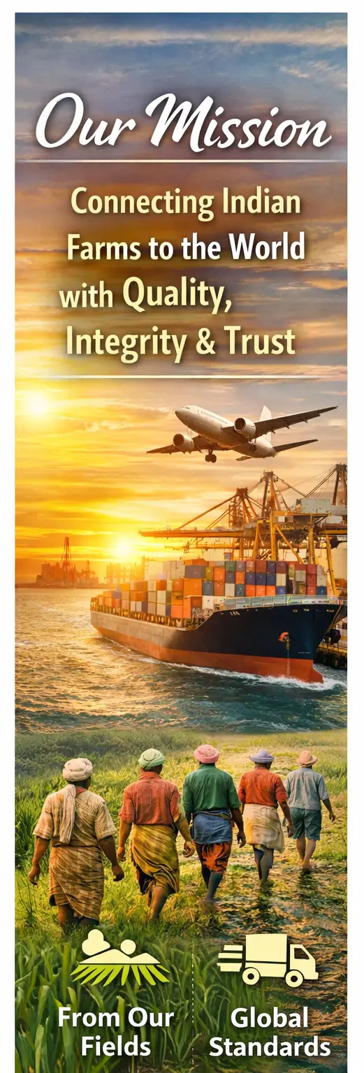 We are committed to sourcing products responsibly—from our own farms and trusted contract farmers—ensuring consistent quality, transparency, and compliance with international standards. Through ethical trade practices, reliable logistics, and customer-focused service, we aim to build long-term partnerships and connect Indian excellence with the world.